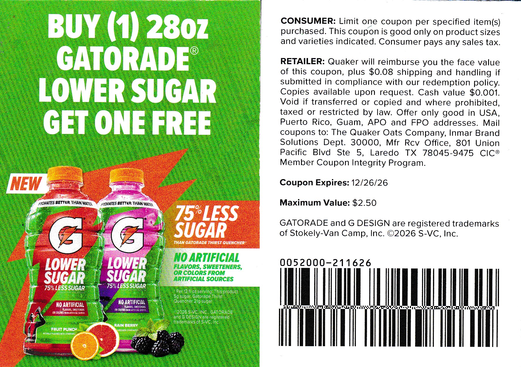 RefundNow > Products > Gatorade Lower Sugar B1G1Free 12/26/26 $2.50 value