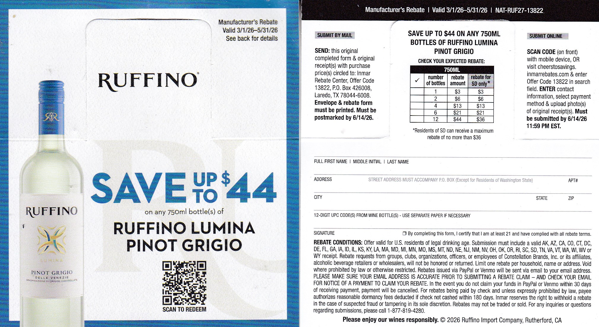 RefundNow > Products > Ruffino Pinot Grigio CA + pm 6/14/26 Laredo TX $44