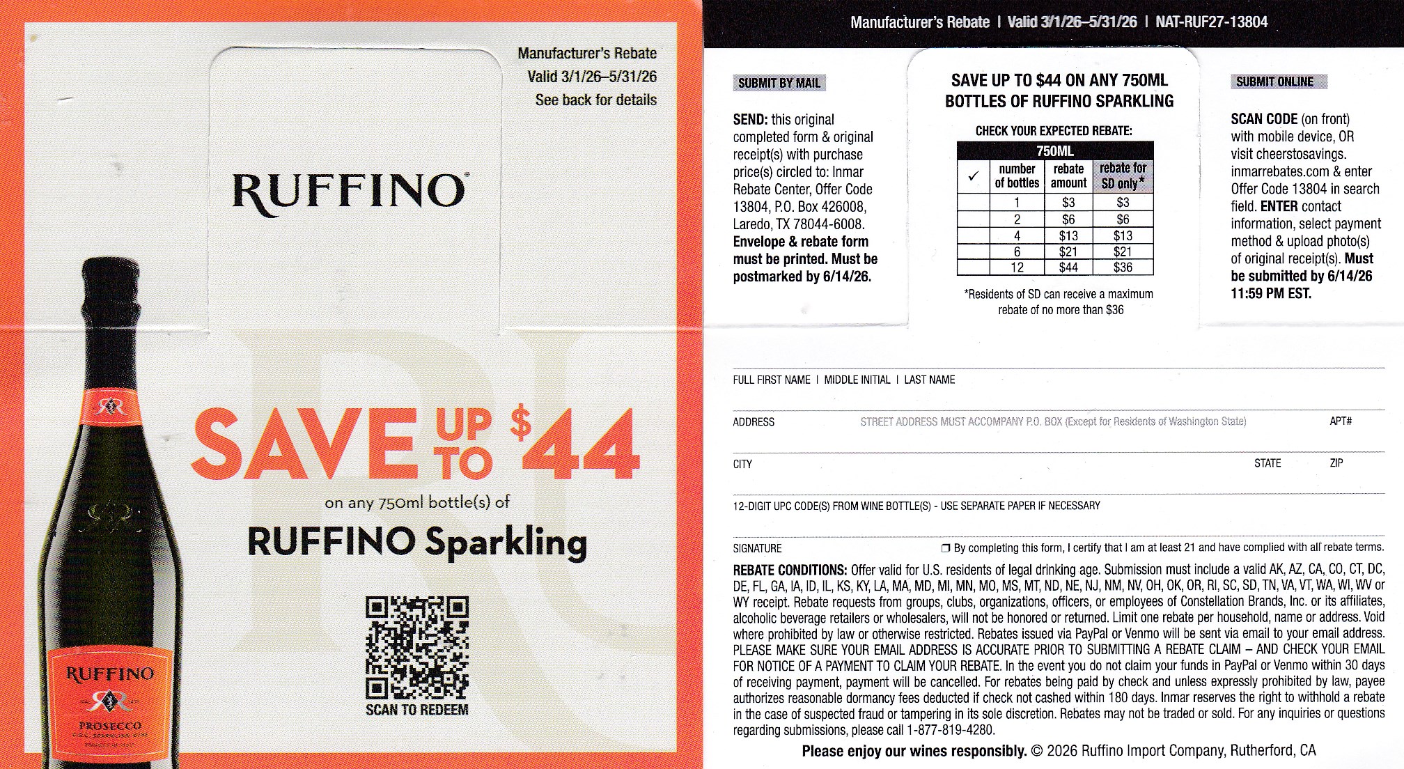RefundNow > Products > Ruffino Sparkling CA + pm 6/14/26 Laredo TX $44